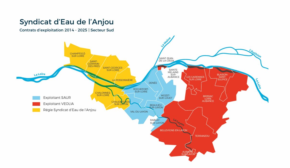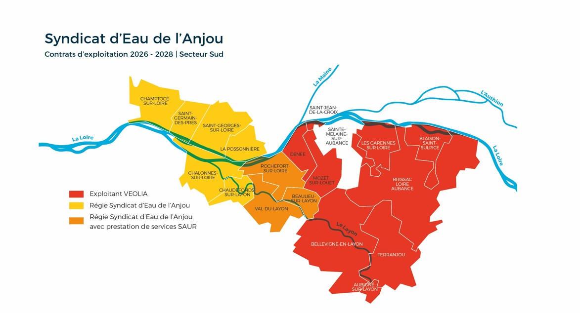 Les communes de Beaulieu-sur-Layon, Rochefort-sur-Loire et Val-du-Layon restent exploitées par la société SAUR, dans un cadre renouvelé : depuis le 1er janvier 2026, l’exploitation s’y effectue dans le cadre d’un contrat de prestation de services de trois ans (2026–2028), en lieu et place de la précédente délégation de service public de longue durée. Ce nouveau cadre permet au Syndicat d’Eau de l’Anjou d’ajuster plus finement les modalités d’exploitation en fonction des besoins.